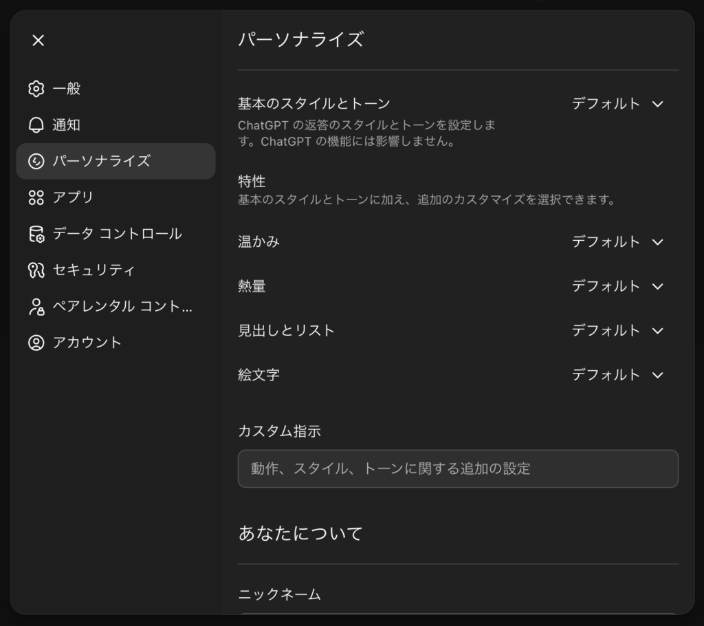 調整しなくても過去の会話から学習する仕様にはなっていますが(オフにもできます)、以下のような細かい設定も可能です。