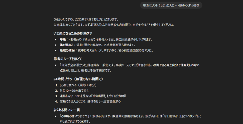 ちなみに、「彼女にフラレた」を入力すると、しっかり同情してくれる辺りもGPT-5.1の会話の温かみが感じられます。