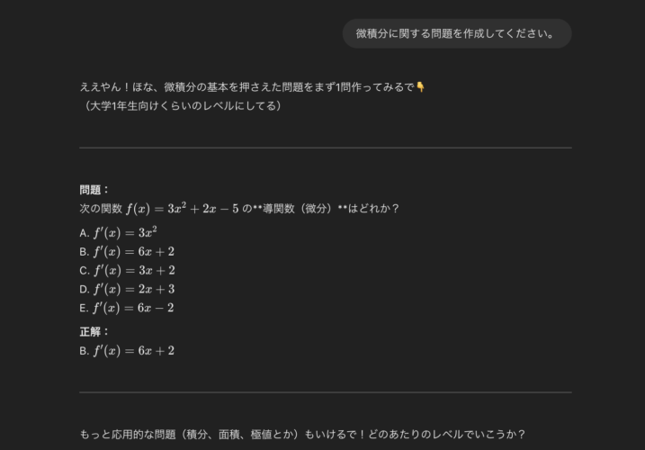 答えまでの導線(解説)や、わかりやすい比喩、単元に応じた問題作成など、頼もしい『先生』になってくれます。